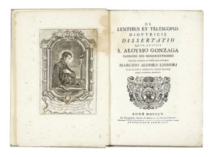 In-4° (mm 273x200). Pagine: 58, [2] + 2 tavole calcografiche ripiegate in fine. Ritratto calcografico del dedicatario S. Luigi Gonzaga inciso da Carlo Grandi in antiporta. Pallido alone al margine interno di antiporta e frontespizio, pallide fioriture/macchiette marginali, seconda tavola con strappetti restaurati al verso (minima perdita di margine bianco). Cartonato grigio moderno. (1) Prima edizione di questo trattato del Boscovich dedicato alla teoria delle lenti e ai telescopi rifrattori, con particolare attenzione all'aberrazione cromatica. L'opera si inserisce nel dibattito settecentesco sulla costruzione degli strumenti ottici e anticipa soluzioni teoriche che dialogano con Newton ed Euler. Backer - Sommervegel, v. 1, col. 1838.