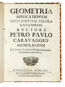 Caravaggio Pietro Paolo, Geometria applicationum deficientium figura data specie... Mediolani: ex Typographia archiepiscopali: per Bartholomaeum Bidellium, 1659.