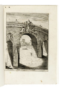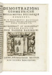 In-4° (mm 210x145). Pagine [4], 59, [1]. Frontespizio calcografico che raffigura un ponte sul Trastevere con le ami di Urbano VIII Barberini, prima tiratura con nel titolo "Delle misure...". Iniziali e fregi xilografici. A carta F2r inizio di Demostrazioni geometriche della misura dell'acqua correnti con proprio frontespizio che raffigura le armi araldiche di Taddeo Barberini. Tre forellini al margine bianco inferiore del frontespizio, carte ingiallite con occasionali fioriture, fascicolo D con lievi arrossature, F4 con applicazione di testo a correzione nell'ultima stringa di testo. Cartoncino moderno. (1) Prima edizione di un trattato rivoluzionario per l'idraulica moderna, scritto da opera maggiore di Benedetto Castelli (1578-1643), monaco cristiano, matematico e fisico bresciano, collaboratore e amico di Galileo per oltre quarant'anni. Riccardi I, 290. Carli & Favaro 171. Cinti 137 (ediz. del 1660). Govi, I classici che hanno fatto l'Italia, n. 180: "Prima edizione del libro che segna l'inizio dell'idraulica moderna."
