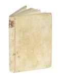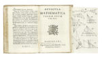 In-8° piccolo (mm 141x92). Pagine: 92; 58, [2] + [3] tavole calcografiche ripiegate in fine. Tavola I e II con il margine inferiore leggermente rifilato, per il resto ottimo esemplare ottimo nella sua pergamena semi-flessibile coeva, tagli spruzzati, firma di possesso del mercante Agostino Imperiale Giulio alla sguardia anteriore, ex libris Enrico Giusti al contropiatto. (1) Prime edizioni, di estrema rarità su mercato. Tommaso Ceva (1648-1737) fu un poeta, matematico e professore gesuita al collegio di Brera a Milano. La prima opera introdusse la teoria della gravità di Newton in Italia e contribuì alla sua diffusione tra gli ambienti intellettuali europei. La seconda opera, Opuscula mathematica, raccoglie i trattati matematici più influenti di Ceva, con particolare attenzione al complesso problema della trisezione dell'angolo. Le tavole pieghevoli sono progettate in modo che i diagrammi rimangano visibili al lettore mentre scorre il testo. Il De natura gravium discute la gravità da un punto di vista filosofico e teologico, riportando le idee di Newton sull'argomento.