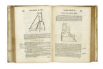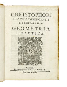 In-4° (mm 208x153). Pagine: [32], 439, [33]. Ultima carta bianca. Emblema dei gesuiti al frontespizio e in fine, numerosissimi diagrammi geometrici nel testo, tabelle varie. Qualche fascicolo occasionalmente brunito in modo pallido, ma per il resto buon esemplare nella sua pergamena rigida coeva (restaurata) con leone rampante che pianta una freccia scura e decorazioni in oro ai piatti (piccoli stemmi nobiliari non identificati agli angoli), dorso liscio decorato in oro (qualche macchia). (1) Prima edizione di questo importante manuale di geometria applicata con metodi e calcoli utili per misurazioni e costruzioni, che ebbe ampia diffusione negli ambienti accademici e tecnici del Seicento. Cristoforo Clavio (1538-1612) è considerato una figura chiave nella matematica del periodo per l'ampiezza degli insegnamenti geometrici nei suoi testi pedagogici.