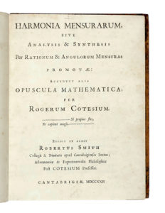 Cotes Roger, Harmonia mensurarum, sive analysis & synthesis per rationum & angulorum mensuras promotae... Cantabrigiae: [s. e.], 1722.