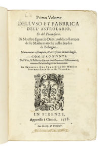 In-4° (mm 218x150). Pagine: [16], 325, [3]. Numerosi diagrammi nel testo in bella impressione, fregi ed iniziali xilografiche. Buona copia, qualche leggera macchiolina, tagli talvolta un po' stanchi e risarciti, ultima carta con parte inferiore risarcita. Prime carte con angoli interni superiori risarciti. Piena pergamena posteriore con titoli in oro entro tassello al dorso, sguardie rinnovate. (1) Il secondo volume non fu mai pubblicato (cfr. SBN). Danti fu un influente matematico, pittore, cartografo, costruttore di mappamondi e strumenti che lavorò a stretto contatto con i Medici e, in seguito, dopo essere stato esiliato dalla famiglia, con il Papa. Durante la sua permanenza a Firenze, progettò il quadrante e la sfera armillare sulla facciata del convento di Santa Maria Novella. In quest'opera, pubblicata in italiano volgare, Danti approfondisce l'utilizzo dell'astrolabio e altri strumenti scientifici. Riccardi I, 389.