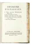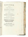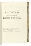 8 opere rilegate in un volume in-8° (mm 195x128). Pagine: 135, [1]. Ritratto calcografico di Galileo in antiporta. [CON:] Id., Elogio del Cavalieri. [Milano: per Giuseppe Galeazzi, 1778]. Pagine: [4] 53, 8 con "Aggiunta all'elogio del Cavalieri". Assente la carta bianca D4, fascicolo B e "Aggiunta" bruniti. [CON:] Id., Elogio del Cavaliere Isacco Newton. [Milano: Galeazzi, 1778]. Pagine: 132. Stampato su carta forte. [CON:] Id., Elogio di Tito Pomponio Attico. (Al colophon:) Milano: nell'imperial monistero di s. Ambrogio Magg., 1780. Pagine: 60. [CON:] Id., Lettera del sig. abate Paolo Frisi intorno agli studi del sig. dottor Tommaso Perelli a monsig. Angelo Fabroni. Pisa: presso Jacopo Grazioli, 1784. Pagine: 29, [3] + 1 tavola calcografica ripiegata. In barbe e completo della bianca finale. [CON:] [Id.], Elogio di Maria Teresa imperatrice. (Al colophon:) In Pisa: presso Jacopo Grazioli, 1783. Pagine: 115, [1]. [CON:] [Id.], Elogio del conte Donato Silva. In Milano: presso Giuseppe Marelli, 1779. Pagine: 29, [3]. Stampato su carta leggermente azzurrata e completo dell'ultima bianca. [CON:] Id., Opuscoli filosofici. 1. Delle influenze meteorologiche della luna. 2. Dei conduttori elettrici. 3. Dell'azione dell'olio nell'acqua. 4. Del calore superficiale, e centrale della terra. 5. Dei fiumi sotterranei. In Milano: appresso Giuseppe Galeazzi, 1781. Pagine: [6], 118, [2]. Completo della bianca finale. Ottimo esemplare in cartonato flessibile coevo rivestito in bella carta marmorizzata e con tagli similmente marmorizzati, titolo anticamente manoscritto al dorso. (1) Bellissima raccolta. Paolo Frisi (1728-1784), matematico, astronomo e presbitero milanese, insegnò in vari atenei italiani e fu figura di spicco dell'illuminismo scientifico italiano. Scrisse elogi di Galileo, Cavalieri e Newton, contribuendo in misura rilevante alla diffusione delle loro idee in Italia. Per Frisi, Galileo è "padre e martire della scienza moderna" e Newton l'esempio di scienziato completo, mentre Cavalieri è figura comparabile a Galileo per importanza. La sua Lettera indirizzata ad Angelo Fabroni è un'indagine su studi astronomici e scientifici dell'epoca, mentre gli Opuscoli filosofici sono saggi sui fenomeni naturali.