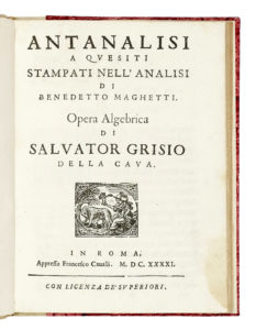 Grisio Salvatore, Antanalisi a quesiti stampati... In Roma: appresso Francesco Cavalli, 1641.