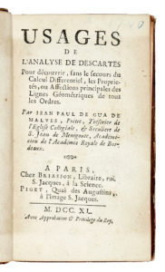 Gua de Malves Jean Paul (de), Usages de l'Analyse de Descartes... A Paris: chez Briasson, 1740.