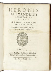 Heron Alexandrinus, Spiritalium liber... Parisiis: Aegidium Gorbinum sub insign Spei..., 1583.