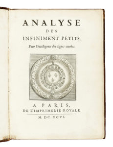 L'Hospital Guillaume Francois Antoine (de), Analyse des infiniment petits, pour l'intelligence des lignes courbes. A Paris: de l'imprimerie royale, 1696.