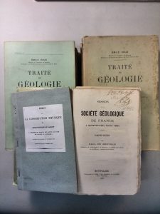 de couverture détaché (avec manque), sinon bon exemplaire.— JOINTS : - ROUVILLE (Paul-Gervais de). Session de la Société Géologique de France à Montpellier (Octobre 1868). Montpellier, Boehm & fils, 1869 ; in-8 broché. Orné de 23 figures et cartes hors texte lithographiées (sauf une), dont 3 à double page, 2 repliées et une aquarellée à la main. Exemplaire avec un envoi autographe signé de l'auteur. - Essai sur la constitution physique et géognostique du bassin à l'ouverture duquel est située la ville de Vienne en Autriche. Académie des Sciences, 13 novembre 1820. Journal de physique, novembre 1820 ; plaquette in-8 agrafée, couverture moderne.