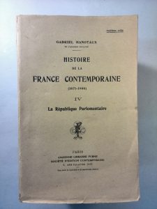 HANOTAUX (Gabriel). Histoire de la France contemporaine (1871-1900). Paris, Combet & Cie, 1902 ; 4 forts vol. in-8, brochés. Portrait de l'auteur en frontispice, 20 portraits reproduites en héliogravure hors texte et une carte repliée. Derniers...