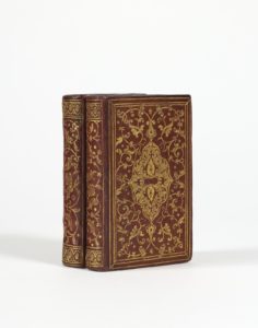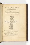 Paris, Robert Estienne, 1568. 2 volumes in-16 (123 x 82 mm) de [16] ff., 494 pp., [1] f. bl. sign. à-àà8 a-z8 A-H8 et 342 pp., [1] f. bl., [20] ff. sign. aa-zz8 Aa8 ; maroquin rouge, grand décor d’arabesques avec fleurons azurés sur les plats, grand cartouche à fond azuré au centre, filets dorés en encadrement, dos lisses muets ornés de même, fer à l’olive en tête et en pied, tranches dorées (Reliure de l’époque).Seule édition du Nouveau Testament en grec publiée par Robert II Estienne (1533-1570), conformément aux deux éditions dites « O mirificam » de 1546 et 1549, avec l’appareil critique de l’édition in-folio de 1550 publiée par son père Robert I Estienne (1503-1559).