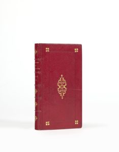 Paris, Jean Houzé, 1586. 2 parties en un volume in-12 (151 x 80 mm) de 144 ff. (mal ch. 142), [2] ff. (Stances de Pibrac), 36 ff., sign. A-M12 ã2 et AA-CC12 ; maroquin rouge, filet à froid et fleurons dorés aux angles, large fleuron Renaissance doré au centre, dos orné, dentelle intérieure, tranches dorées sur marbrure (Duru & Chambolle, 1862).Quatrième édition augmentée de cette importante anthologie de poésie religieuse parue pour la première fois en 1580. Elle comprend 42 pièces, dont 15 nouvelles, de poètes tant protestants (tels Maisonfleur, Marin Le Saulx, Antoine de Chandieu et Yves Rouspeau), que catholiques (Desportes, Belleau, Du Bellay, Ronsard, Pierre Duval, etc.).