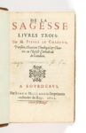 Bordeaux, Simon Millanges, 1601. In-8 (153 x 94 mm), veau blond, dos lisse orné, pièce de titre rouge, dentelle intérieure, tranches rouges (Reliure de la fin du XVIIIe siècle).Édition originale rare de l'œuvre majeure de Pierre Charron (1541-1603), conçue comme un prolongement des Essais de Montaigne, dont Charron était le disciple et l’ami.