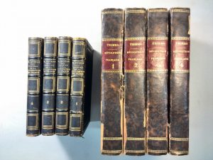 [HISTOIRE].— THIERS (Auguste). Histoire de la Révolution française. Bruxelles et Liège, Riga, 1839 ; 4 vol. in-8, cartonnage papier à la colle, dos longs, pièces de titre de chagrin rouge, non rognés, [Rel. de l'époque]. Édition ornée de...