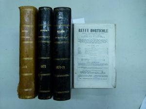 [HORTICULTURE]. Revue horticole. Journal d'horticulture pratique. Paris, Librairie agricole de la Maison rustique, 1865, 1870-1872 ; 4 années en 3 vol. in-8, demi-basane fauve pour le premier, demi-basane noire pour les suivants, dos lisses....