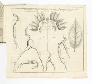 Paris, Joseph Mongé, 1718. In-12 (150 x 88 mm), veau moucheté, triple filet doré, dos orné, tranches marbrées (Reliure de l’époque).Édition originale rare, illustrée d'une planche dépliante dessinée et gravée par Louis Boudan représentant L'Aureliane de Canada, en chinois Gin-seng, en iroquois Garent-oguen.