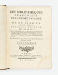 Paris, Saillant & Nyon, 1772-1773. 6 volumes in-4 (258 x 191 mm), veau blond, triple filet doré, dos orné, tranches marbrées (Reliure de l'époque).Première édition collective, publiée par Jean-Antoine Rigoley de Juvigny, des catalogues de La Croix du Maine et d'Antoine du Verdier. Ces deux ouvrages sont très précieux pour l'histoire littéraire française jusqu'à la fin du XVIe siècle.