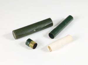ÉCRITOIRE DE CAMPAGNE — cylindrique du début XIXe siècle en maroquin vert à long grain (226 mm, diam. 50 mm).