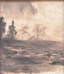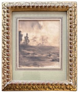 Dessin à la plume et au lavis, à l’encre brune (métallo-gallique), signé « V. H. » en bas à droite ; 112 x 95 mm. ; encadrement ancien. Beau dessin représentant un paysage quelque peu fantastique ; au fond d’une lande désolée, apparaissent dans la brume quelques arbres, le toit d’une chaumière, et, sur la gauche, une église dont on distingue le clocheton et la rosace, qui évoque les « burgs » qu’aimai recréer Hugo.