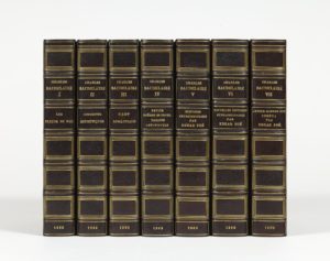 Paris, Michel Lévy, 1868-1870. 7 volumes in-12 (183 x 115 mm), demi-maroquin havane avec coins, dos orné de caissons au triple filet doré, non rogné, couverture et dos (Stroobants).Première édition collective, en partie originale et « extrêmement importante », selon Clouzot, puisqu’elle comprend en édition originale une partie des Fleurs du Mal, les Petits poëmes en prose, les Curiosités esthétiques (sauf les deux Salons déjà parus) et L’Art romantique (sauf Gautier et Wagner).