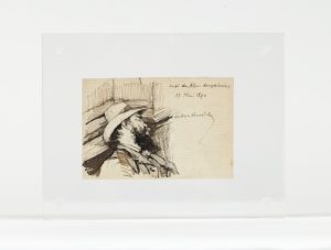 [VERLAINE (Paul)] — BERRICHON (Paterne). Portrait de Paul Verlaine endormi. Dessin à l’encre de Chine sur papier (135 x 90 mm), signé et légendé :