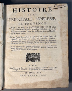 AIX-EN-PROVENCE. — [MAYNIER (B. de)]. Histoire de la principale noblesse de Provence. Aix, Joseph David, 1719. In-4, basane porphyre, dos orné, pièce de titre rouge, tranches mouchetées rouge (Reliure de l’époque). - Édition originale. -...