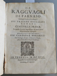 parut en 1612, la seconde en 1613, puis parurent à de nombreuses reprises ensemble.TrajanoBoccalini (1556-1613), l’auteur de ces satires, en obtint, dit-on, beaucoup de succès et beaucoup de haine. - L’ouvrage se compose de deux Centuries, la première parut en 1612, la seconde en 1613, puis parurent à de nombreuses reprises ensemble. - Page de garde attaquée par une mouillure.