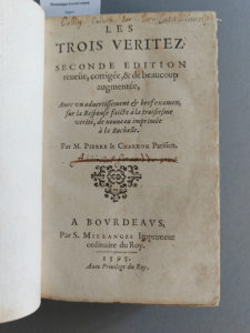 [CHARRON (Pierre)]. Les Trois veritez. Seconde édition. Bordeaux, Simon Millanges, 1595. 2 parties en un volume in-8, veau fauve (Reliure moderne). - Troisième édition de cette apologie de la religion catholique par Pierre Charron (1541-1603), ami...