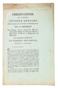 CORSE. — GREGORJ (Antoine). Observations du citoyen Antoine Gregorj armateur du corsaire l’Hirondelle sur la réplique du citoyen Joseph-Antoine Morin, procureur fondé des citoyens Michel, Durand, et Reboul, négociants de Marseille : aux...