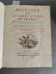 [DAVILA (Henri)]. Histoire des guerres civiles de France, sous les règnes de François II, Charles IX, Henri III & Henri IV. Amsterdam, Arkstée&Merkus, 1757 [1754]. 3 volumes in-4, veau fauve, armoiries sur les plats, dos orné, pièces rouges,...
