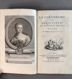 DUBOCAGE (Madame). La Colombiade, ou la foi portée au Nouveau Monde. Paris, Desaint& Saillant, Durand, 1756. In-8, veau marbré, dos lisse orné, tranches rouges (Reliure de l’époque). - Édition originale, ornée d’un portrait de l’auteure...