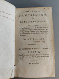 (Reliure de l’époque). - Édition originale de ce recueil de tours de cartes et d’énigmes pour jouer en société. - Annotation manuscrite ancienne sur une garde : sorte de supplément aux récréations mathématiques. - Quelques rousseurs, coupes et coins usagés.