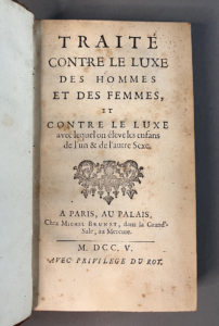 l’époque). - Édition originale. - L’auteur, avocat, aborde le luxe en général, les parures des femmes, le luxe de la table, les meubles, l’éducation des enfants, etc. - Quelques annotations anciennes dans les marges, dont une très amusante au sujet du luxe des équipages (p. 159) et de ceux qui promènent dans de beaux carrosses [leurs] merveilleuses et leurs greluchons. - Piqûres sur le titre et à quelques feuillets. Reliure restaurée.