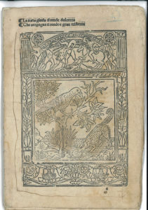 réutilisés dans des éditions ultérieures avec des encadrements différents. Texte en caractères romains, 40/41 lignes à la page. - Les feuillets présents sont les cahiers c8 d8 (le feuillet d7 incomplet d’une partie du bois, e8 incomplet des feuillets e et e4 1 f. indéterminé), soit en tout 22 bois (environ 12 x 10 cm). - Quelques salissures, traits de plume sur certains bois, renfort de papier dans le fond de certains feuillets.
