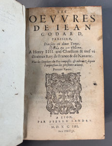[GODARD (Jean)]. Les Œuvres, divisées en deux tomes. Plus les Trophées du Roy composez &adioutez depuis l’impression des présentes œuvres. Lyon, [Jean Tholosan pour] Pierre Landry, 1594. 2 tomes en un volume in-8, veau marbré, dos orné,...