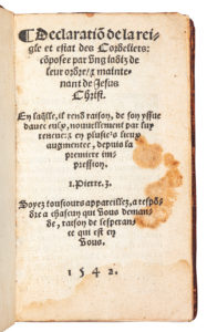 brune, dos orné (Reliure du XVIIIe siècle). - Édition gothique extrêmement rare, impriméeàGenève par Jean Michel. (Bechtel, D-109/2 ; GLN-1369.) - L’auteur, dont le nom Jehan Menard se lit dans un acrostiche à la fin de la Déclaration, était originaire de Touraine. Ce moine défroqué, ancien cordelier et adversaire de Calvin, dénonce ici les abus du clergé. Son ouvrage, attribué par erreur à François Lambert dans l’Index de La Sorbonne, avait d’abord paru en 1540 sous le titre Epistrechrestienne aux frères mineurs de l’ordre de S. Françoys. - Le volume se termine, après la fin du texte page 266, par 3 feuillets non chiffrés (un extrait du psaume 83 et l’acrostiche, un chant royal composé par l’auteur, des corrections et le colophon). - Ex-libris armorié gravé en latin de Jacques Gaillard, chanoine de Rouen. - Exemplaire avec le dernier feuillet en fac-similé, auquel on a ajouté à la suite, une reproduction du titre de l’édition originale de 1540 (feuillet qui ne fait pas partie de cette édition) : pour «compléter» cet exemplaire, il semblerait qu’on se soit servi de l’exemplaire Stroehlin, conservé à la bibliothèque de Genève et numérisé en ligne, lequel possède ce dernier feuillet à la fin. - Dos très restauré.
