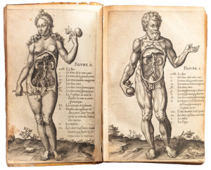 et de 2 surprenantes planches anatomiques gravées en taille-douce figurant Adam et Ève tenant chacun l’objet du péché, les viscères à découvert. - Jourdain Guibelet fut l’un des précurseurs dans l’étude médicale de la dépression. Son livre renferme deux traités particulièrement intéressants : l’un sur la génération de l’homme, avec un chapitre sur la génération des monstres et un autre sur les démons ; l’autre discours, axé sur la mélancolie, ses symptômes et les moyens de la guérir, serait l’une des premières études scientifiques sur les humeurs et la dépression. (Caillet, n°4834 ; Yve-Plessis, n°589.) - Cet ouvrage très rare est l’un des premiers livres imprimés à Évreux, où l’imprimerie fut introduite par Antoine Le Marié vers 1600 (cf. Deschamps, col. 444, et Lepreux, t. III, pp. 411-413). - Ex-libris armorié gravé collé au contreplat supérieur.
