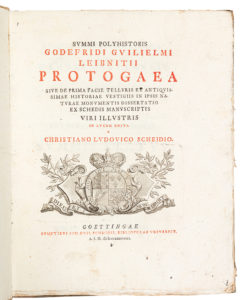 [LEIBNIZ (Gottfried-Wilhelm)]. Protogaea. Göttingen, Jean-Guilume Schmid, 1749. In-4, cartonnage de l’époque. - Édition originale posthume, ornée de 12 planches gravées sur cuivre. - Traité de géogonie écrit par Leibniz (1646-1716) dans les...
