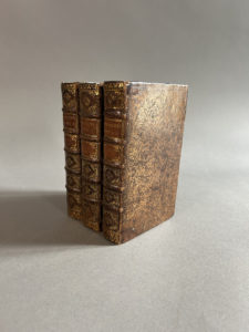 MONTAIGNE. Les Essais. Amsterdam, Antoine Michiels, 1659. 3 volumes in-12, veau moucheté, dos orné, tranches mouchetées de rouge (Reliure hollandaise de l’époque). Frontispice orné du portrait de l’auteur, gravé sur cuivre par Clouwet. -...