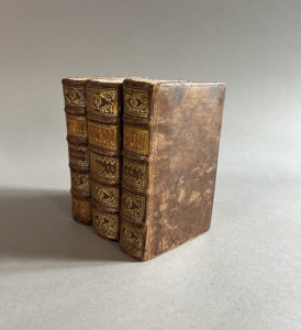 MONTAIGNE. Les Essais. Paris, Christophe Journel, [1659]. 3 volumes in-12, basane brune, dos orné, pièce blonde, tranches rouges (Reliure du début du XVIIIe siècle). Édition ornée à chaque volume d’un joli frontispice gravé avec portrait de...