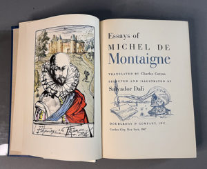 MONTAIGNE. Essays. Translated by Charles Cotton. New York, Doubleday& Co, 1947. In-4, bradel toile bleue, rhodoïd, tête dorée, non rogné (Reliure de l’éditeur). Édition illustrée par Salvador Dali, ornée de bois dans le texte et de 12...