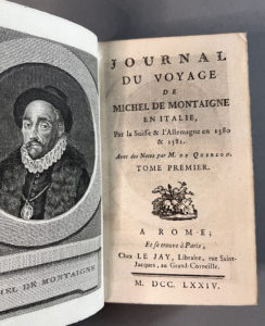 MONTAIGNE. Journal du voyage en Italie Par la Suisse et l’Allemagne en 1580 & 1581. Rome, Paris, Le Jay, 1774. 3 volumes in-12, veau marbré, dos orné, pièce rouge, tranches marbrées (Reliure de l’époque). Édition à la date de...
