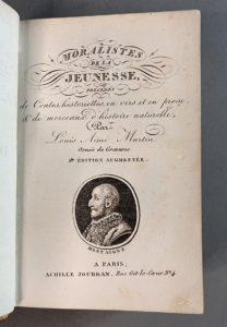 MONTAIGNE. — MARTIN (Louis-Aimé). Moralistes de la jeunesse. Paris, Achille Jourdan, s.d. Petit in-12, basane granitée, roulette dorée, dos lisse orné, pièce de titre verte, roulette intérieure, tranches dorées (Reliure vers 1800). -...