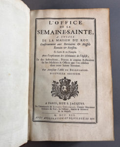 OFFICE (L’) de la Semaine Sainte à l’usage de la maison du roi. Paris, Jacques Collombat, 1741. Grand in-8, maroquin rouge, grande plaque à la fanfare placée dans un encadrement à décor floral, armoiries et chiffre, dos orné, roulette...