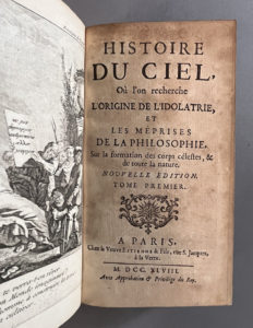 [PLUCHE (l’abbé)]. Histoire du ciel, Où l’on recherche l’origine de l’idolatrie, et les méprises de la philosophie, sur la formation des corps célestes, & de toute la nature. Paris, Veuve Estienne & Fils, 1748. 2 volumes in-12, veau...