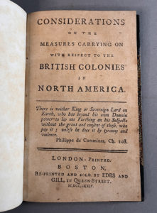 [ROBINSON (Matthew)]. Condiserations on the Measurescarrying on with respect to the British Colonies in North America. Londres, Boston, Edes and Gill, 1774. In-8, demi-chagrin vert avec coins (Reliure du XIXe siècle). Très rare ouvrage sur la...