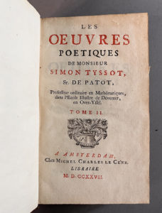 TISSOT (Simon, sieur de Patot). Les Œuvres poétiques. Amsterdam, Michel Charles Le Cêne, 1727. 2 volumes in-12, basane fauve moucheté, dos orné, pièces rouges, tranches mouchetées de rouges (Reliure de l’époque). Édition originale de ces...