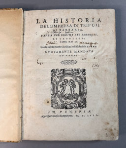 lancée en 1560 par le roi Philippe II d’Espagne sur les côtes d’Afrique afin de reprendre Tripoli aux Ottomans et mettre fin aux raids menés par Piyale Pacha et Dragut depuis les Baléares, conquises par la flotte ottomane en 1558. L’expédition se solda par un échec, la victoire éclatante au large de Djerba le 11 mai 1560 marquant l’apogée de la puissance ottomane en Méditerranée. - La seconde partie de l’ouvrage décrit l’attaque lancée par les Turcs sur Malte cinq ans plus tard, et le célèbre siège qui s’ensuivit. - Nombreuses annotations du XVIIIe siècle dans les marges, ex-libris manuscrit daté 1751 découpé sur le titre. - Quelques légères rousseurs, coins usagés.