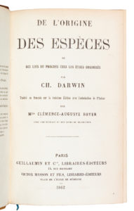 traduction française de cet ouvrage majeur dans l’histoire des sciences, donnée par Clémence-Auguste Royer, philosophe, libre penseuse et féministe, sur la troisième édition, avec l’autorisation de l’auteur. On sait que la préface et les notes de sa traduction ne furent pas du goût de l’auteur. - Exemplaire bien complet de la planche dépliante. Dos foncé. - On joint : DUVAL.Le Darwinisme. Leçons professées à l’école d’anthropologie. Paris, Adrien Delahaye et Émile Lecrosnier, 1886. In-8, demi-chagrin rouge, dos orné (Reliure de l’époque). - Édition originale. Exemplaire très bien relié.