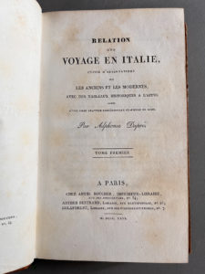 DUPRÉ (Alphonse). Relation d’un voyage en Italie, suivie d’observations sur les anciens et les modernes, avec des tableaux historiques à l’appui. Paris, A. Boucher, Arthus Bertrand, Delaforest, 1826. 2 volumes in-8, basane racinée, filet...